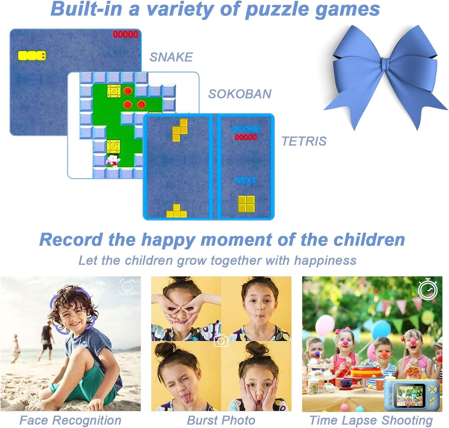 - 【Game Console & MP3 Player】Our childrens camera not only can it be used as a camera and video camera, but also as a game console (including 3 kinds of puzzle games: Sokoban, Snake, Tetris) and a MP3 player.